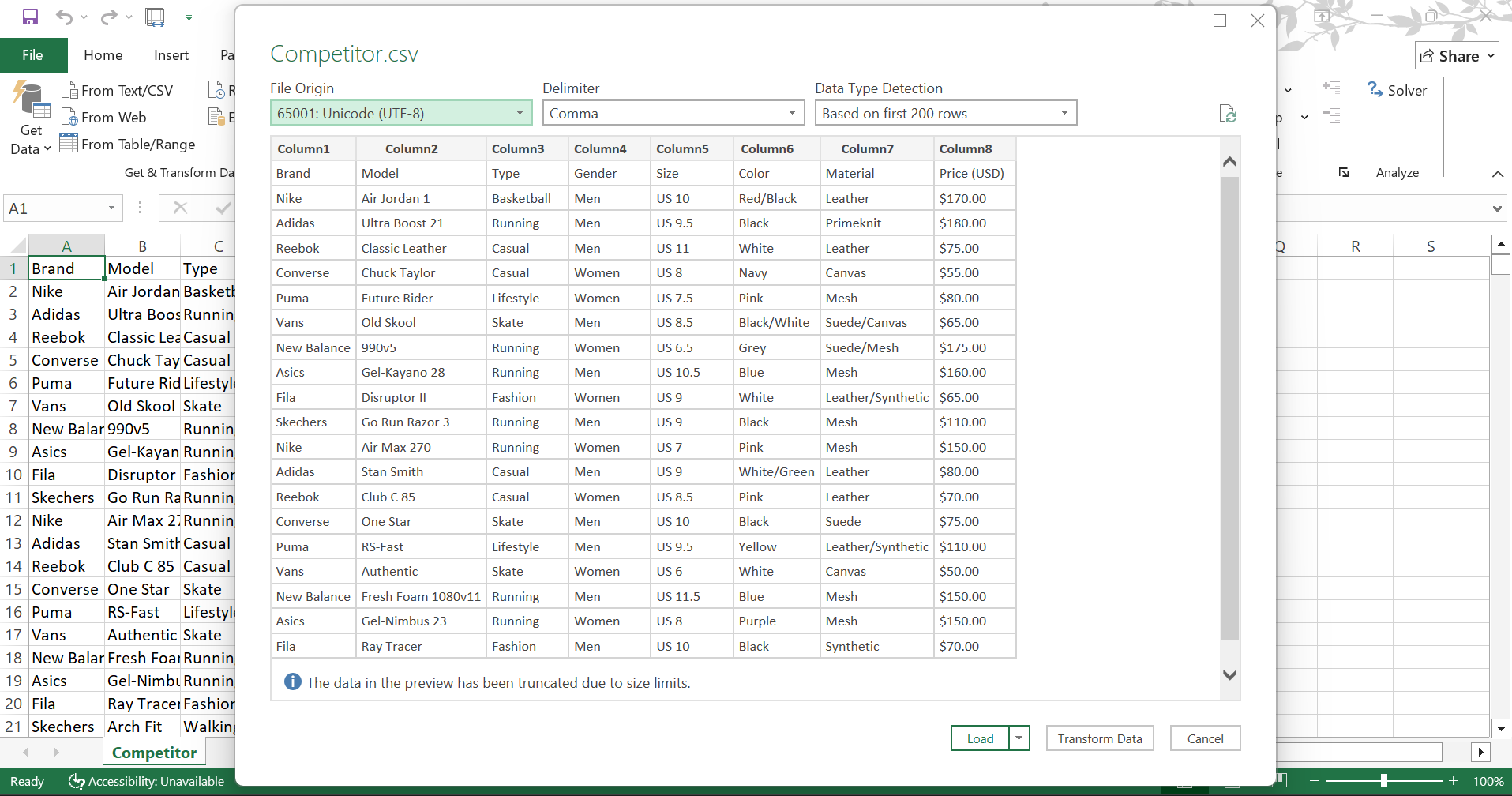 - Model – Specific product model identifier (examples from the dataset include Air Jordan 1, Ultra Boost 21, Classic Leather, Chuck Taylor, Future Rider, Old Skool, Air Force 1, NMD_R1, and many others)