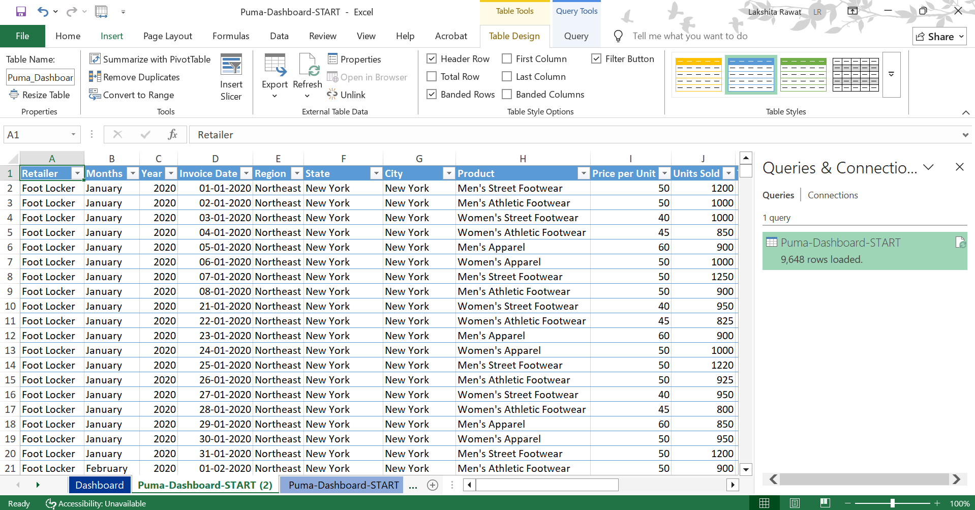 The dataset contains detailed sales records of PUMA US Sales, capturing transactions across different products, retailers, regions, and time periods. The key columns include: